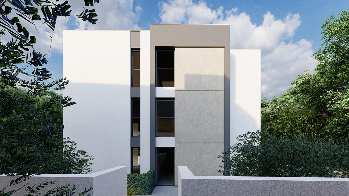 S3 – 2 spavaće sobe, hodnik, dnevni boravak + kuhinja, blagovaonica, kupaonica, vešeraj, natkrivena terasa, stanu pripadaju i dva parkirna mjesta u garaži te spremište – 83.05 m2